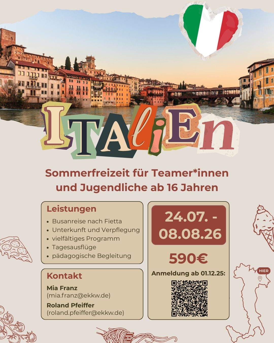Bald ist es soweit! Ab dem 1. Dezember 14. 00Uhr könnt ihr euch hier für die Sommerfreizeit nach Italien anmelden.
