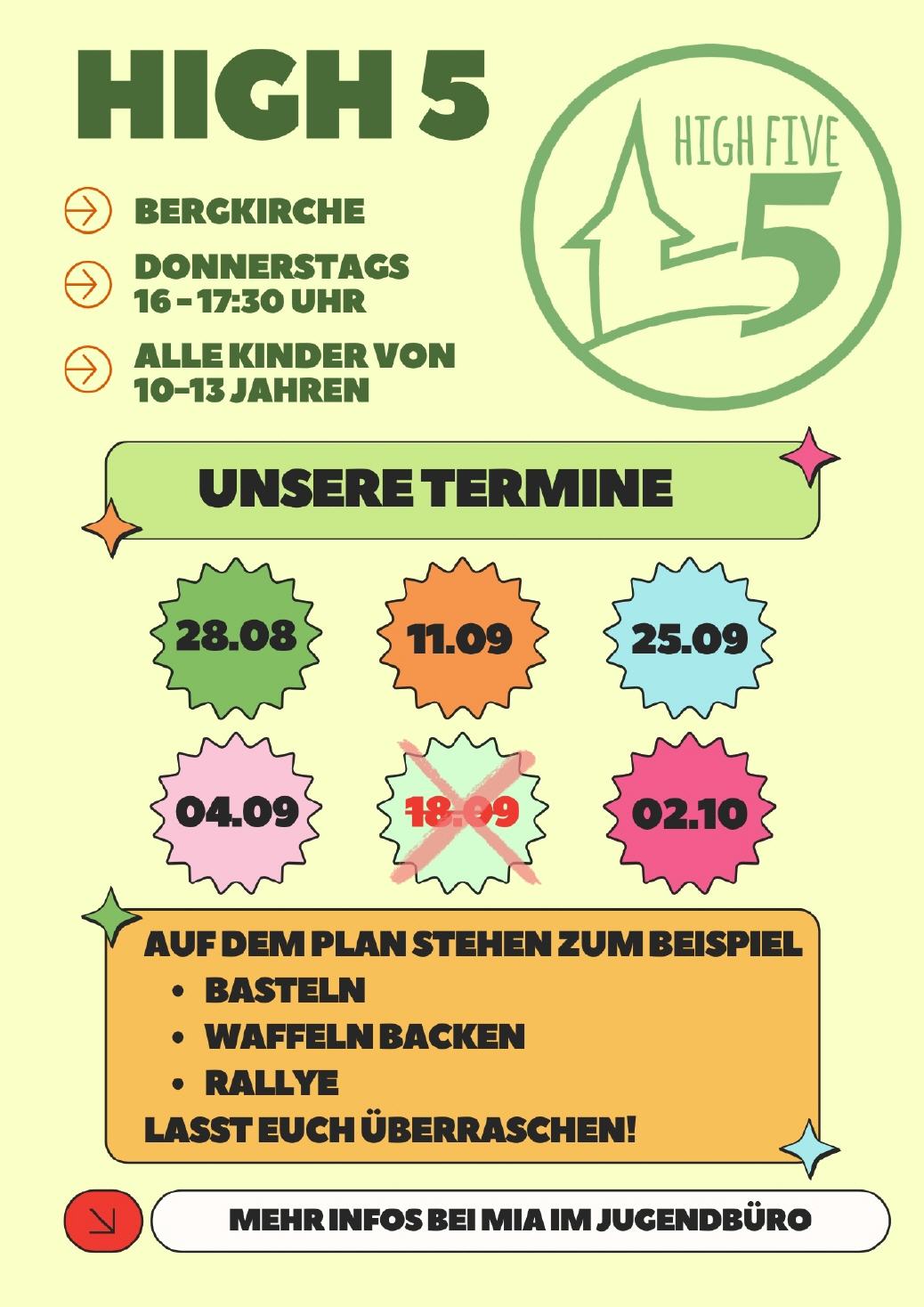 Die High5 sind eine Gruppe für Jugendliche zwischen 10 und 13 Jahren. Wir treffen uns jeden Donnerstag von 16.00 Uhr bis 17:30 Uhr im Jugendtreff an der Bergkirche –Schieferbergstr. 33, Niedergründau . Wir wollen mir dir nicht nur kochen, spielen und basteln, sondern unseren eigenen Film drehen, riesige Sachen bauen, Ausflüge machen und natürlich bei allem eine Menge Spaß haben! Unserer Kreativität sind keine Grenzen gesetzt.